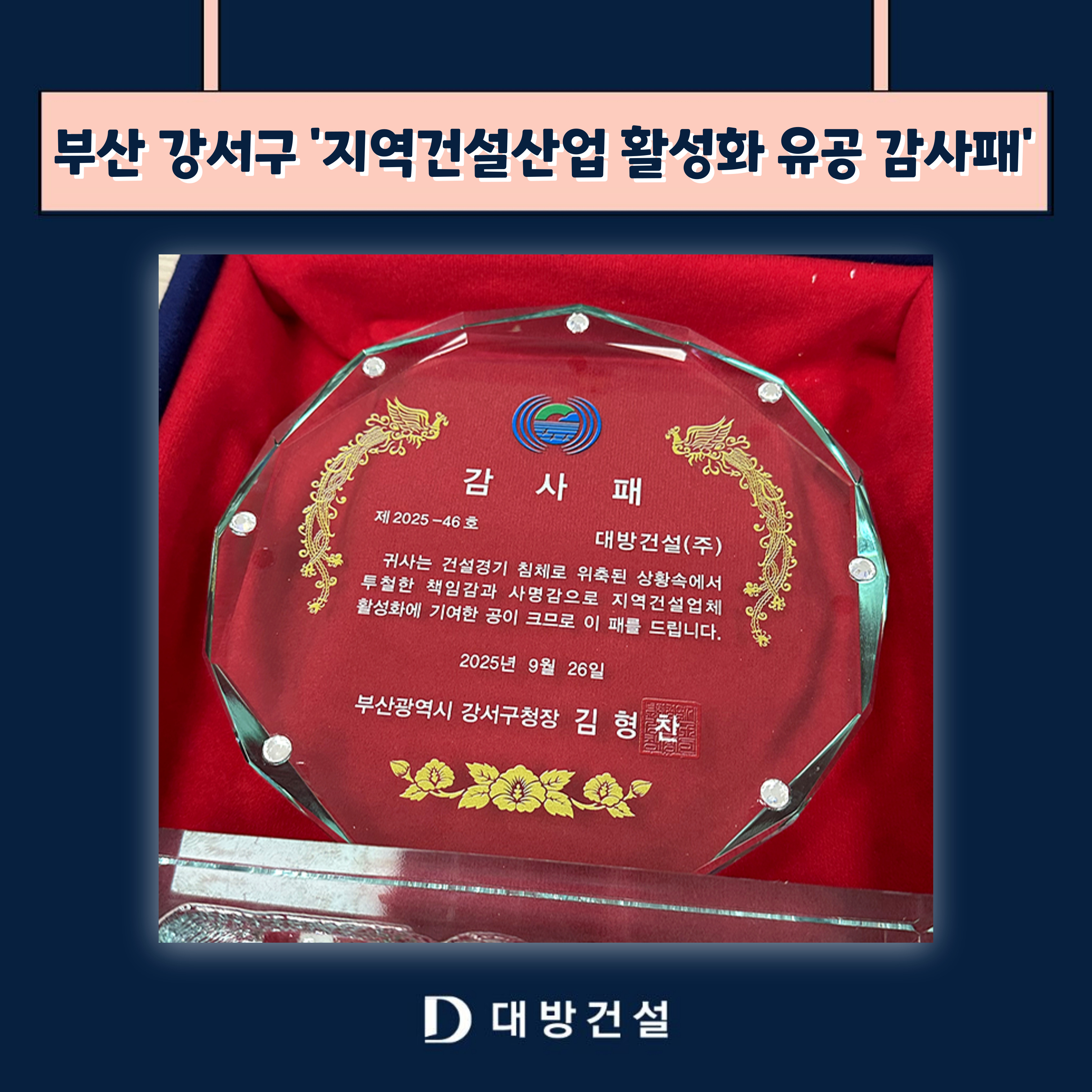 대방건설, 부산 강서구로부터 ‘지역건설산업 활성화 유공 감사패' 수상